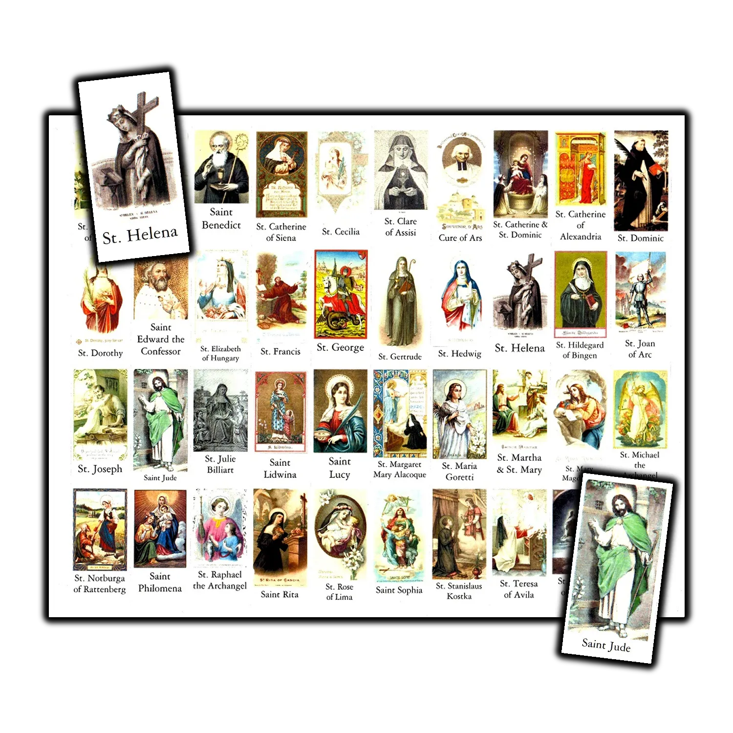 A sheet of 40 assorted saints stickers featuring forty different men and women saints.  The images for these stickers are taken from beautiful old holy cards and artwork.