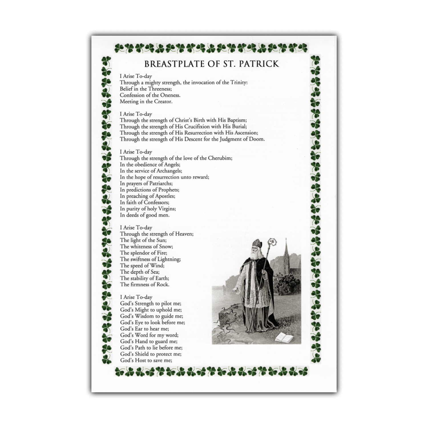 Our deluxe holy card has the prayer printed on both sides, with an antique image of the saint driving the snakes out of Ireland on one side and an image of a Celtic high cross on the other.