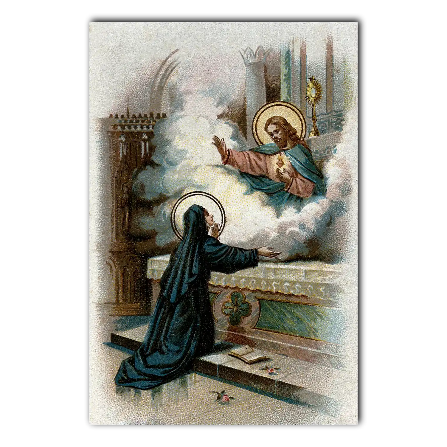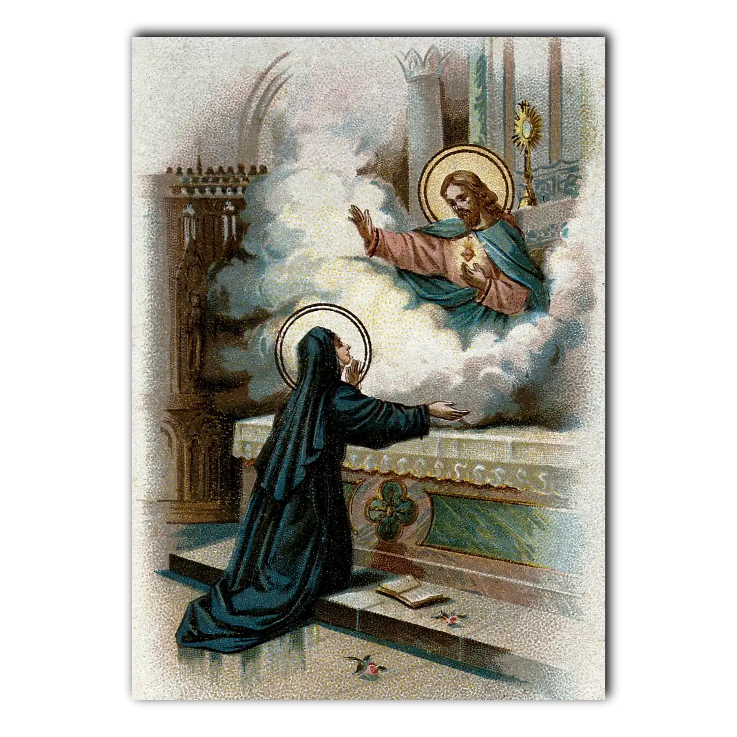 High quality print of Christ appearing to the Blessed Margaret Mary Alacoque and showing His Sacred Heart. Available as 4″ x 6″ and 5″ x 7″