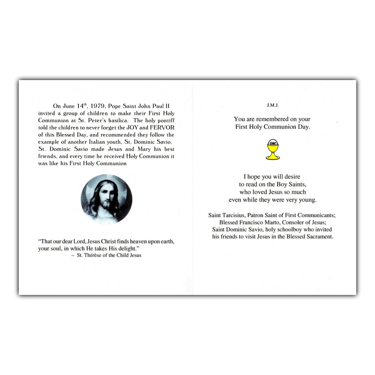 This First Communion Congratulations Card features a vintage image of Jesus holding up a Host surrounded by kneeling and adoring angels.  Inside is a quote from St. Therese of the Child Jesus and a hope that the First Communicant will read on several boy saints who loved Jesus very much.