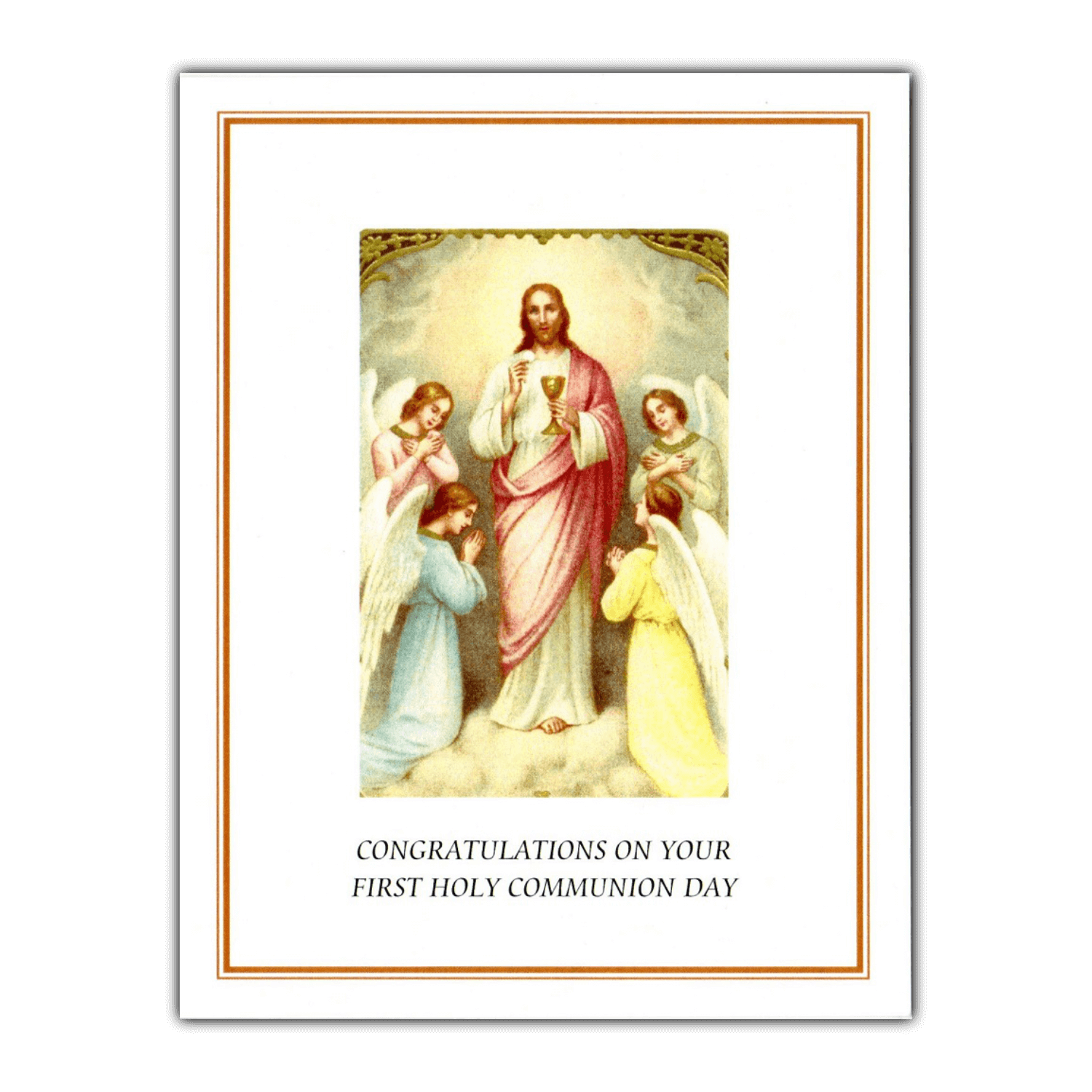 First Communion Congratulations Card featuring a vintage image of Our Lord holding a Host surrounded by kneeling angels.
