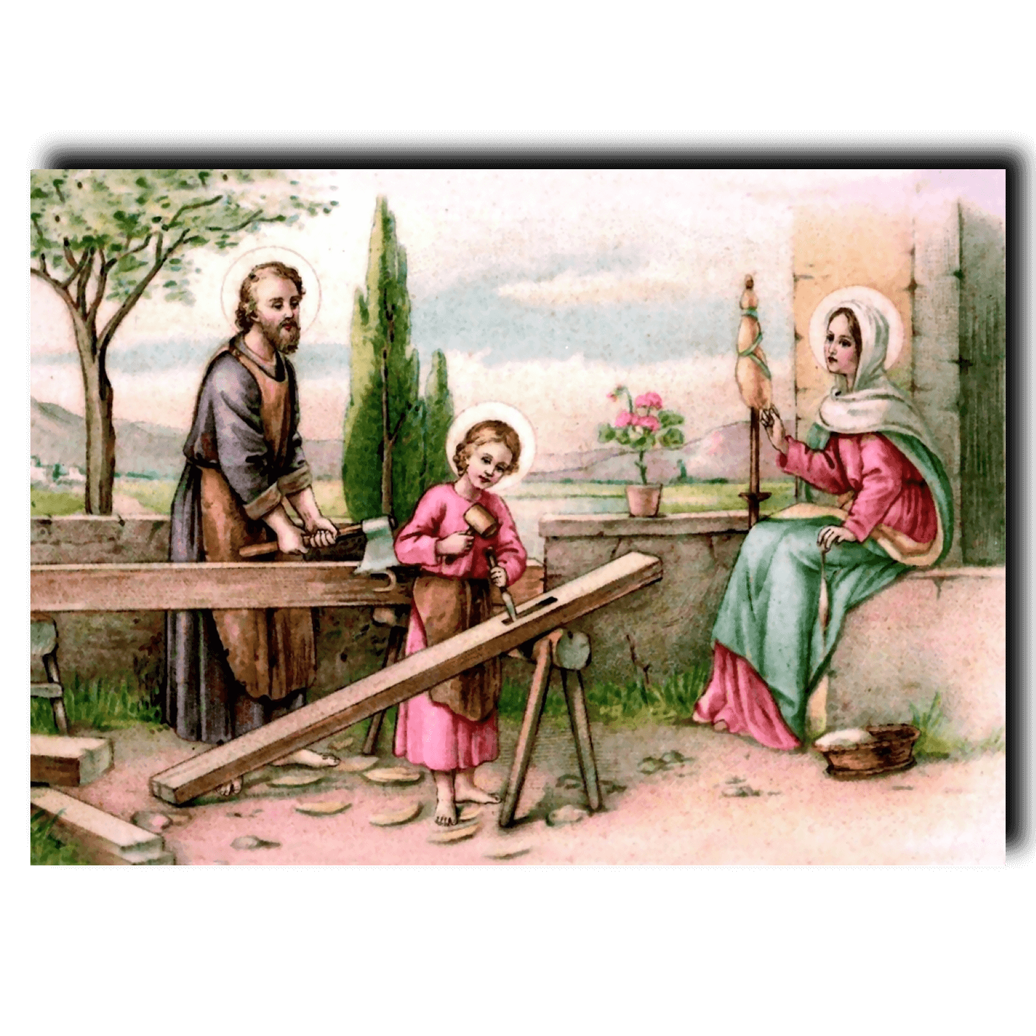 High quality 5″ x 7″ print of the Holy Family at their home in Nazareth from a vintage holy card.