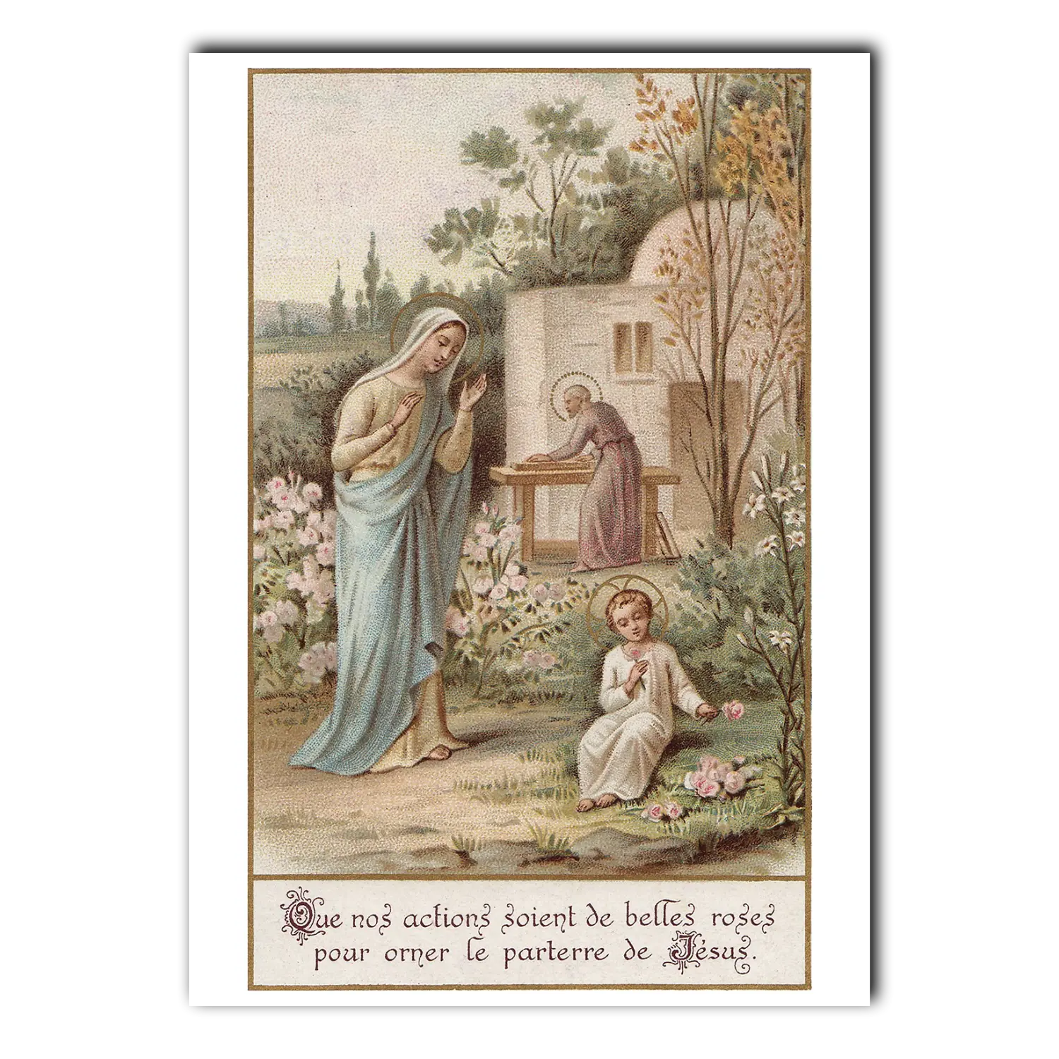 High quality print of the Holy Family sourced from a vintage French holy card.  The translation of the words below the image reads: May our actions be beautiful roses to adorn the lawn of Jesus.