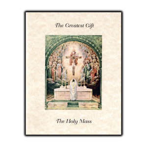 Lines inside for your name, the name of the person for whom Mass is offered, the celebrating priest, and the date.  Text by St. Thomas AquinasO Saving Victim, opening wide the gate of Heaven to man below!  Our foes press on from every side: Thine aid supply, Thy strength bestow.