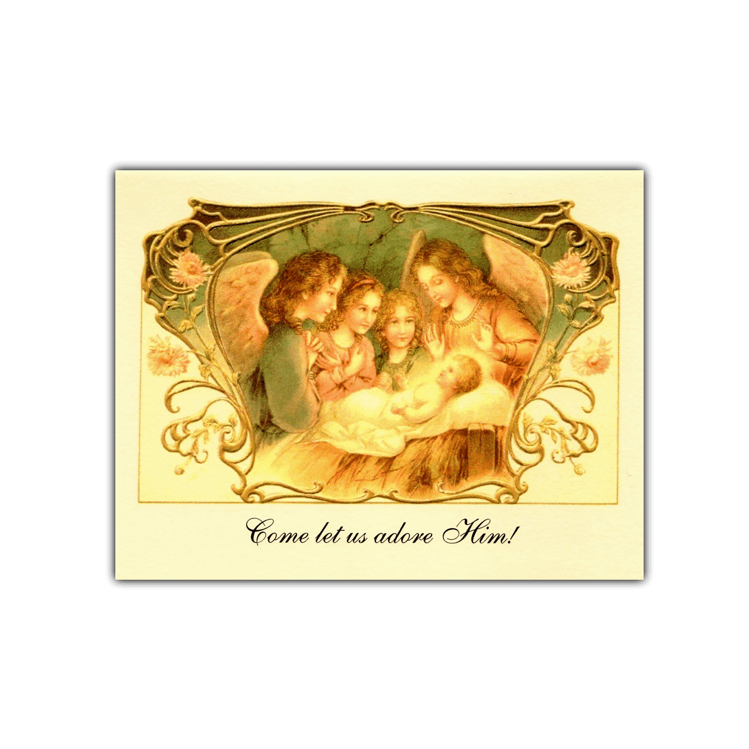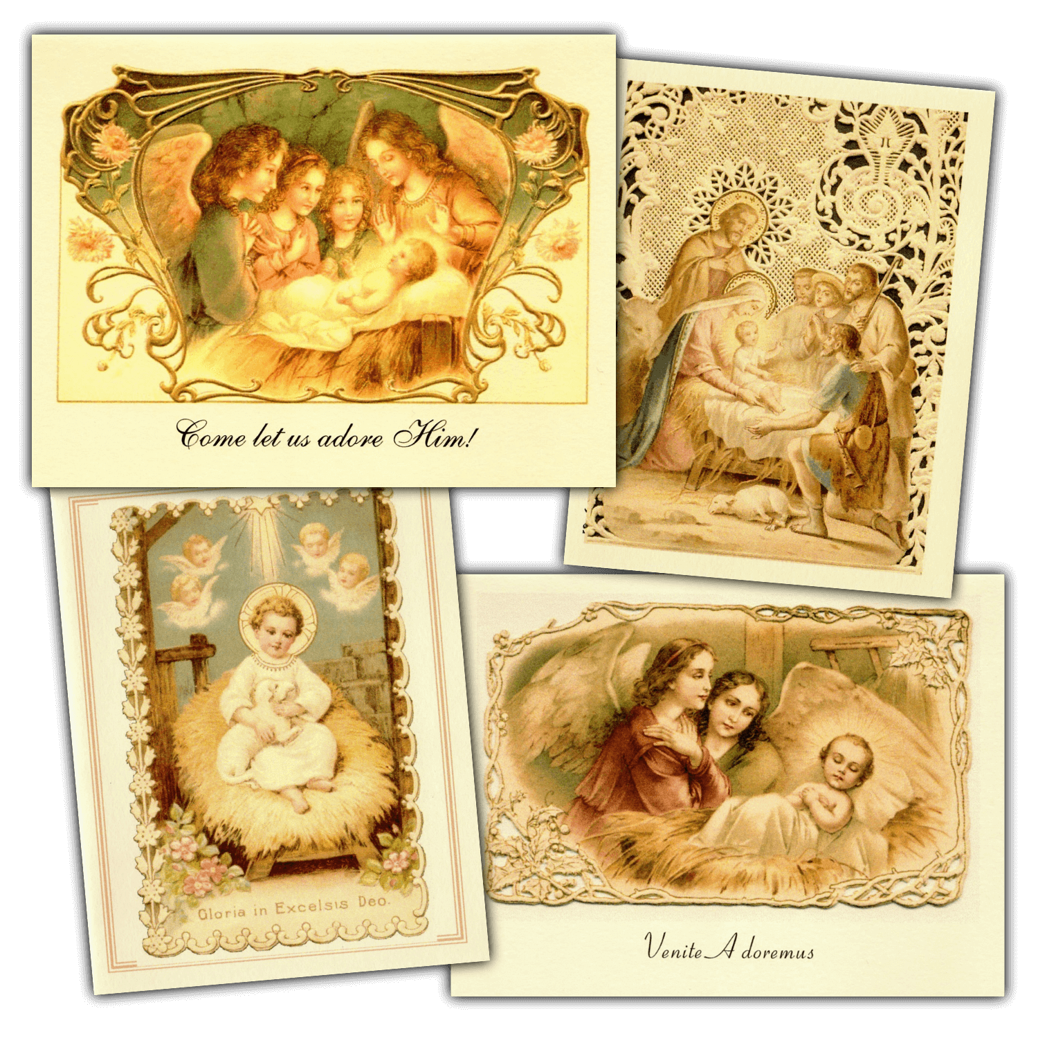 A set of nine Christmas cards featuring beautiful artwork from old, traditional holy cards.  You will not find any shallow messages inside these cards.  We have searched for real heartwarming treasures – passages from the Bible, poems, sacred hymns, and sayings of the saints.  This year make your Christmas greetings to your family and friends come alive in the spirit and joy of Christ!