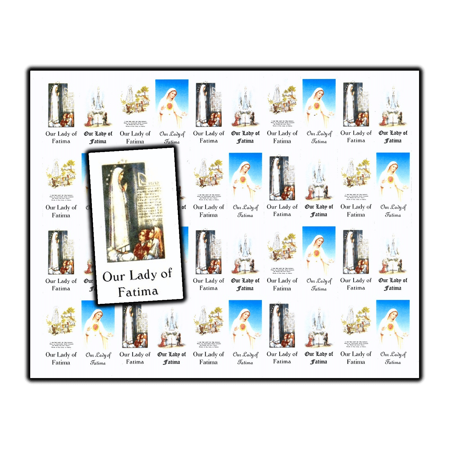 A sheet of 40 stickers featuring four beautiful images of Our Lady of Fatima.  Three are from vintage holy cards showing Our Lady appearing to the three shepherd children and the last is of a statue of Our Lady of Fatima.