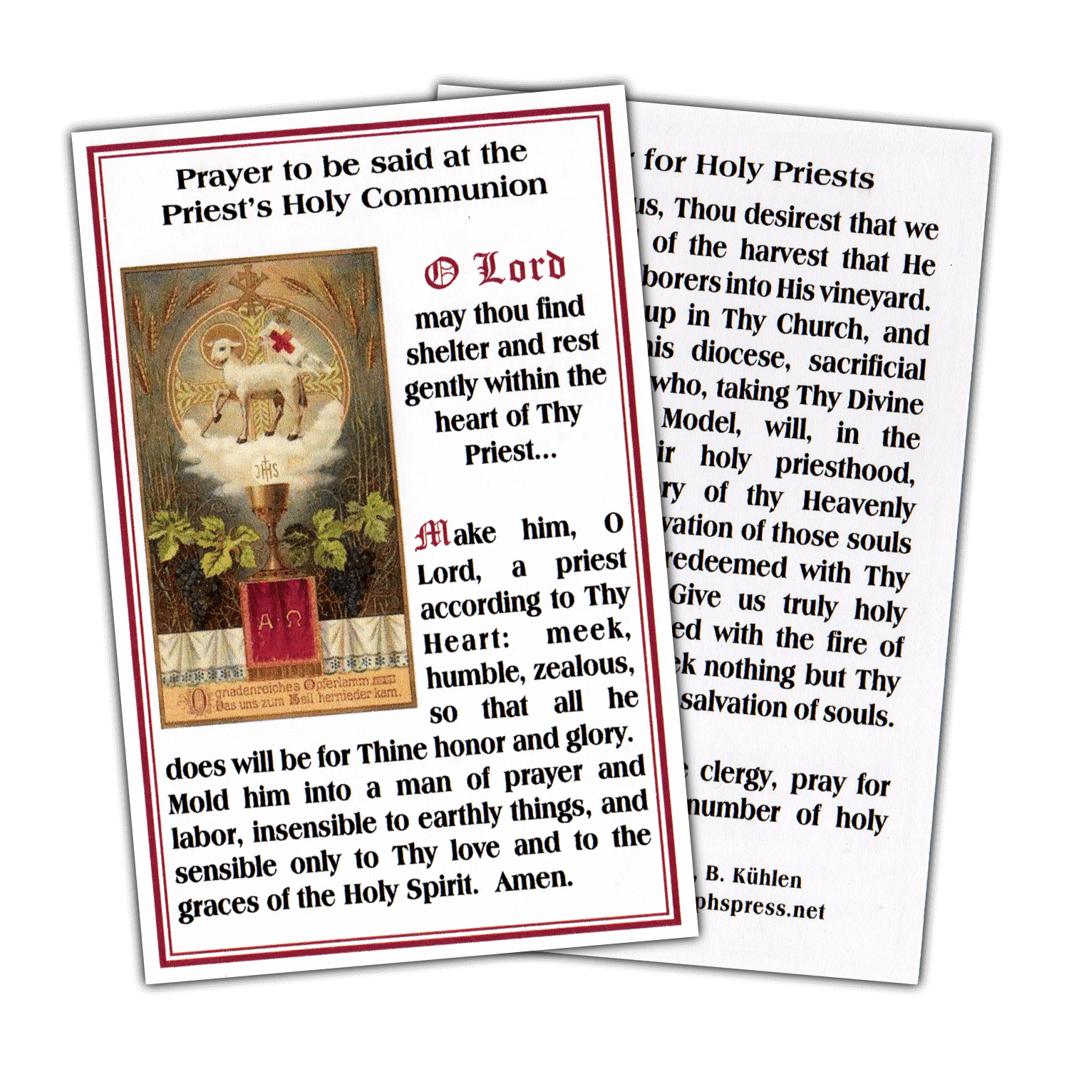 Most especially during these difficult times, the Catholic Church needs both its current priests to be steadfast and holy and for many new priests to become zealous workers in the Lord’s vineyard. This holy card will help you out with prayers for both these intentions. On the front is a Prayer to be said at the Priest’s Holy Communion, asking Our Lord to keep him steadfast and holy, and on the back is a Prayer for Holy Priests, asking Jesus to raise up new priests who will promote the glory of the Heavenly Father and the salvation of souls. An image of the Lamb of God sourced from a vintage German holy card adorns the front.