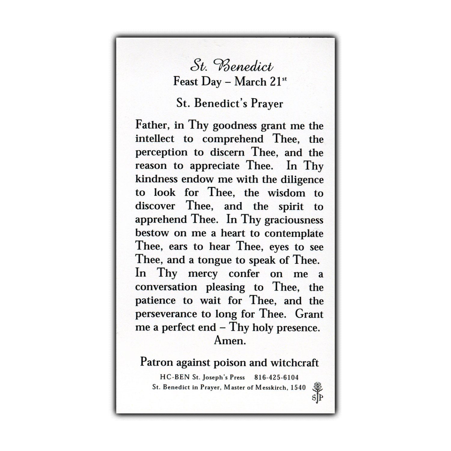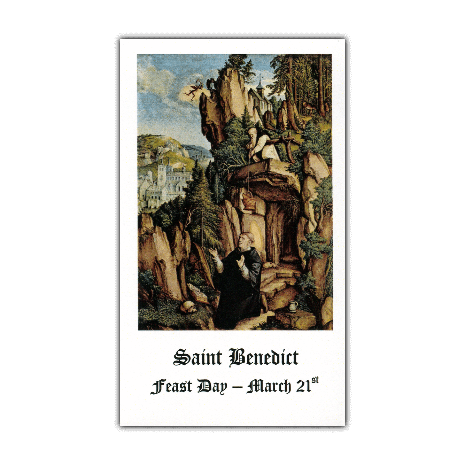 The Saint Benedict holy card features a reproduction of a 16th century German painting by the Master of Messkirck, while a prayer of Saint Benedict is on the reverse side.