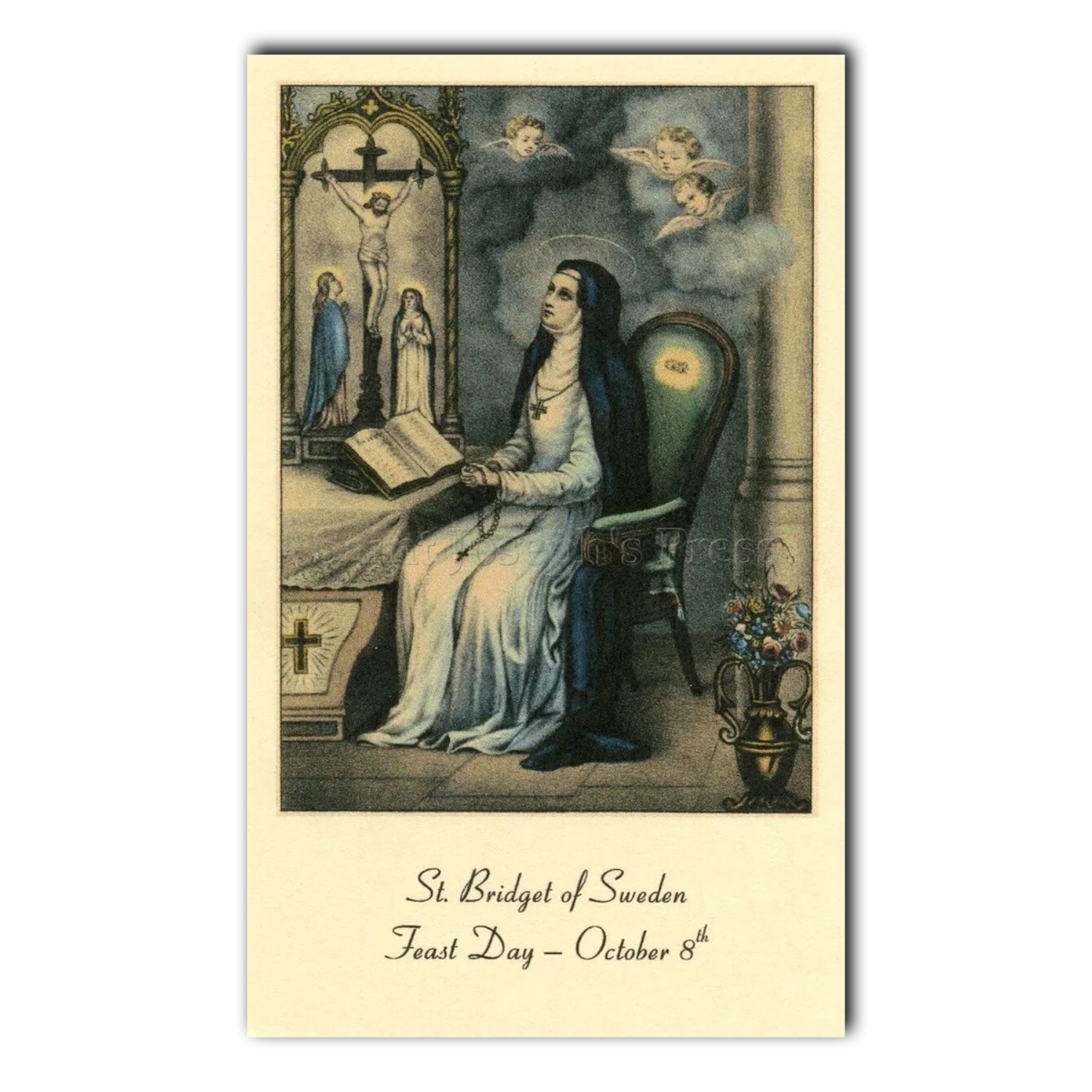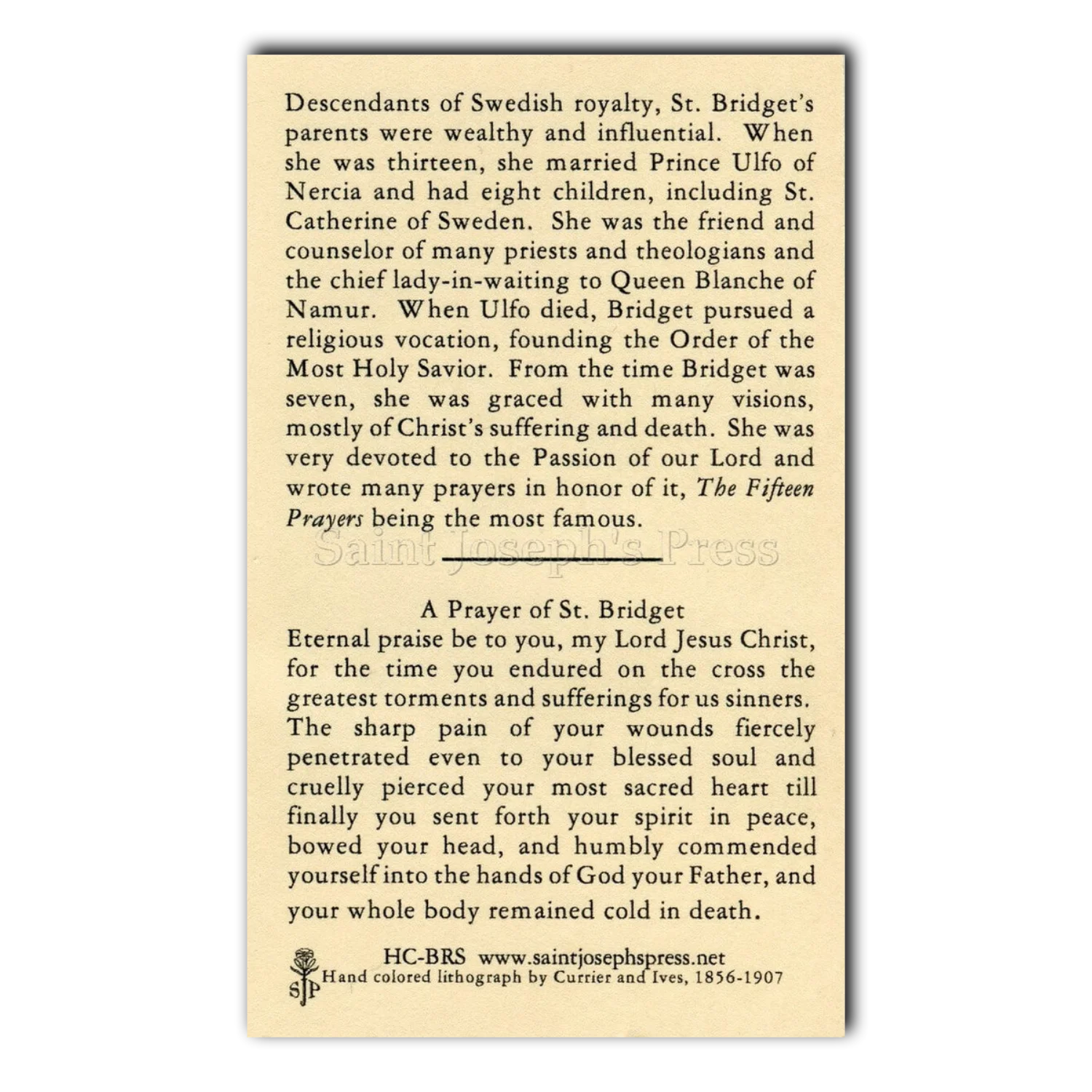 This holy card of Saint Bridget of Sweden features a reproduction of a hand-colored lithograph from the 19th century by the New York printmakers, Currier and Ives. On the back is a brief history of Saint Bridget’s life and a prayer of hers to Jesus in his sufferings on the cross.