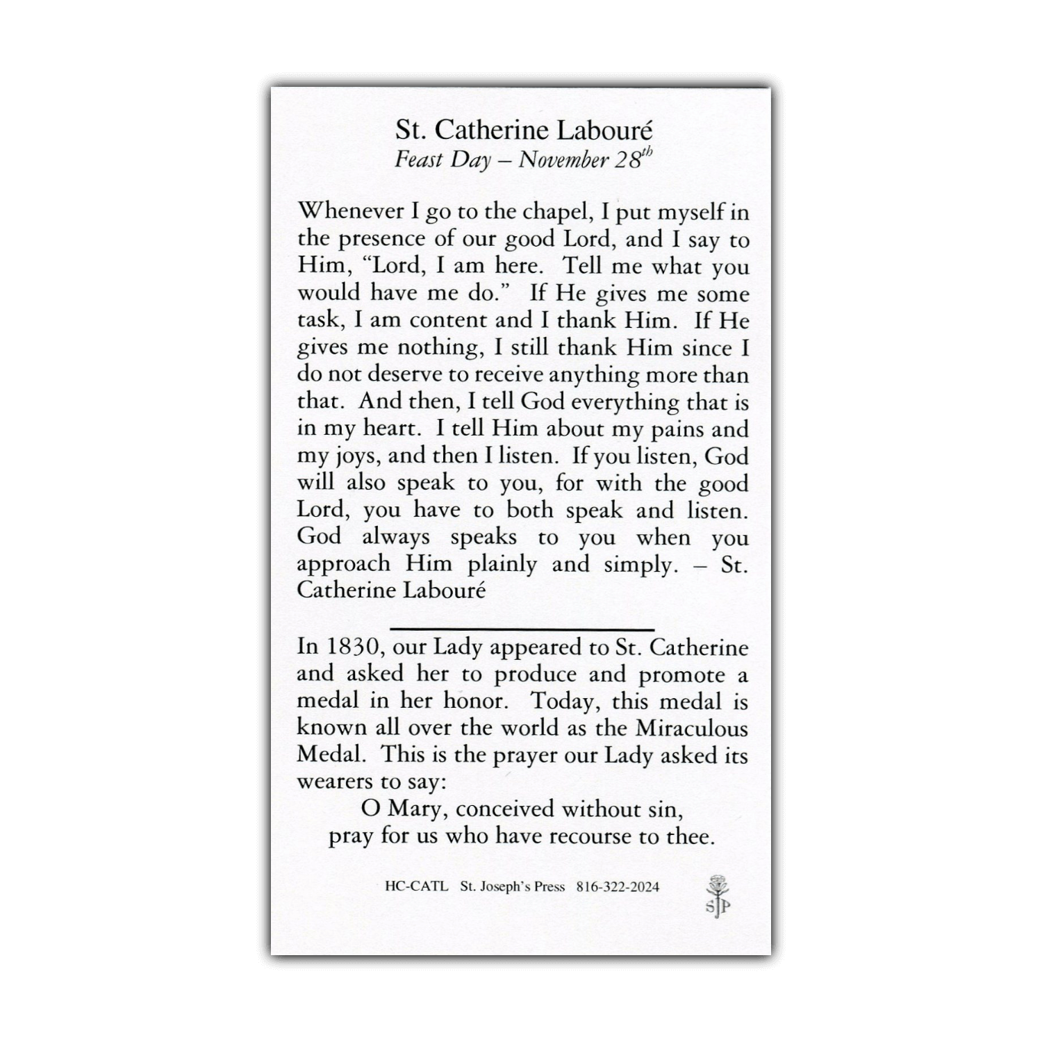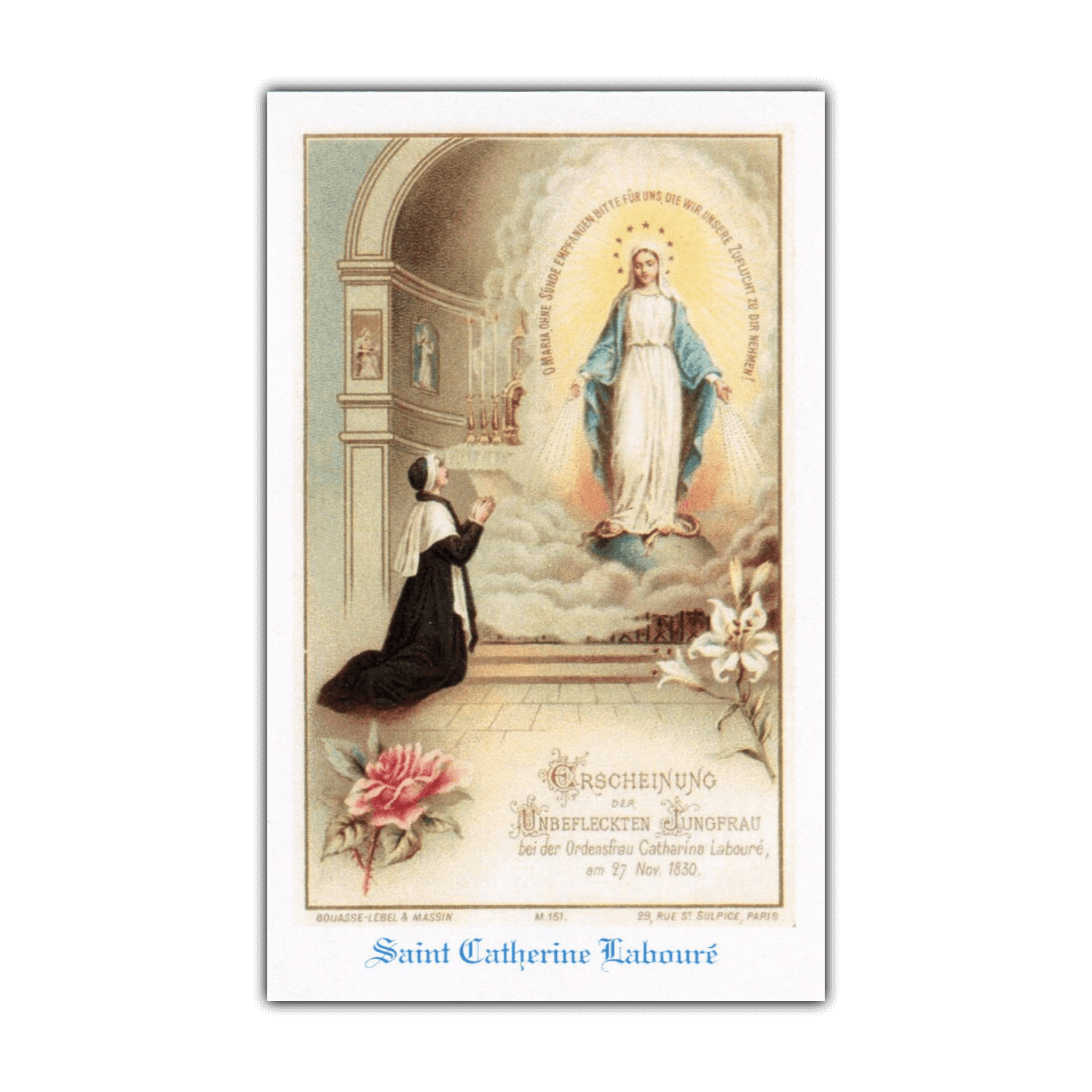 This holy card of Saint Catherine Laboure, a Daughter of Charity to whom the Blessed Mother appeared and gave the Miraculous Medal, features an image from a vintage French holy card. On the back of this holy card is a quote from St. Catherine and the Miraculous Medal prayer.
