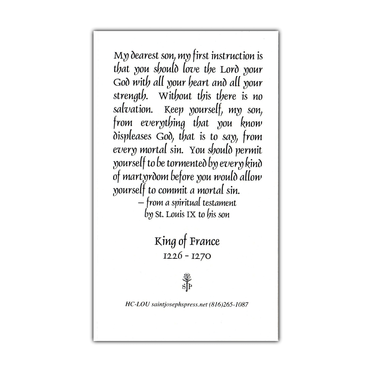 This beautiful holy card of Saint Louis IX of France features a vintage image of St. Louis and a selection from instructions to his son on avoiding mortal sin and staying in a state of grace. St. Louis IX is a patron saint of France and of the Third Order of St. Francis.
