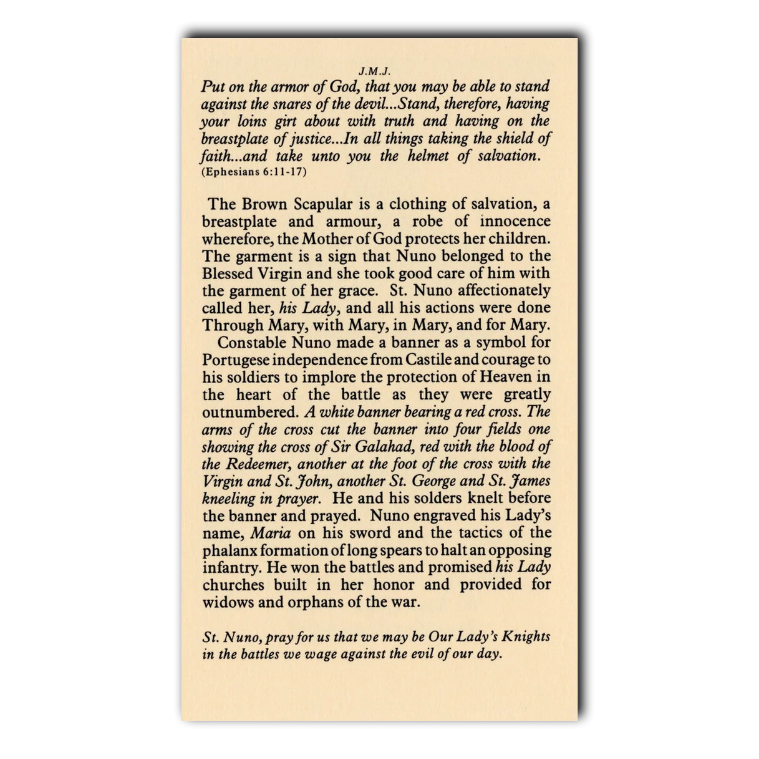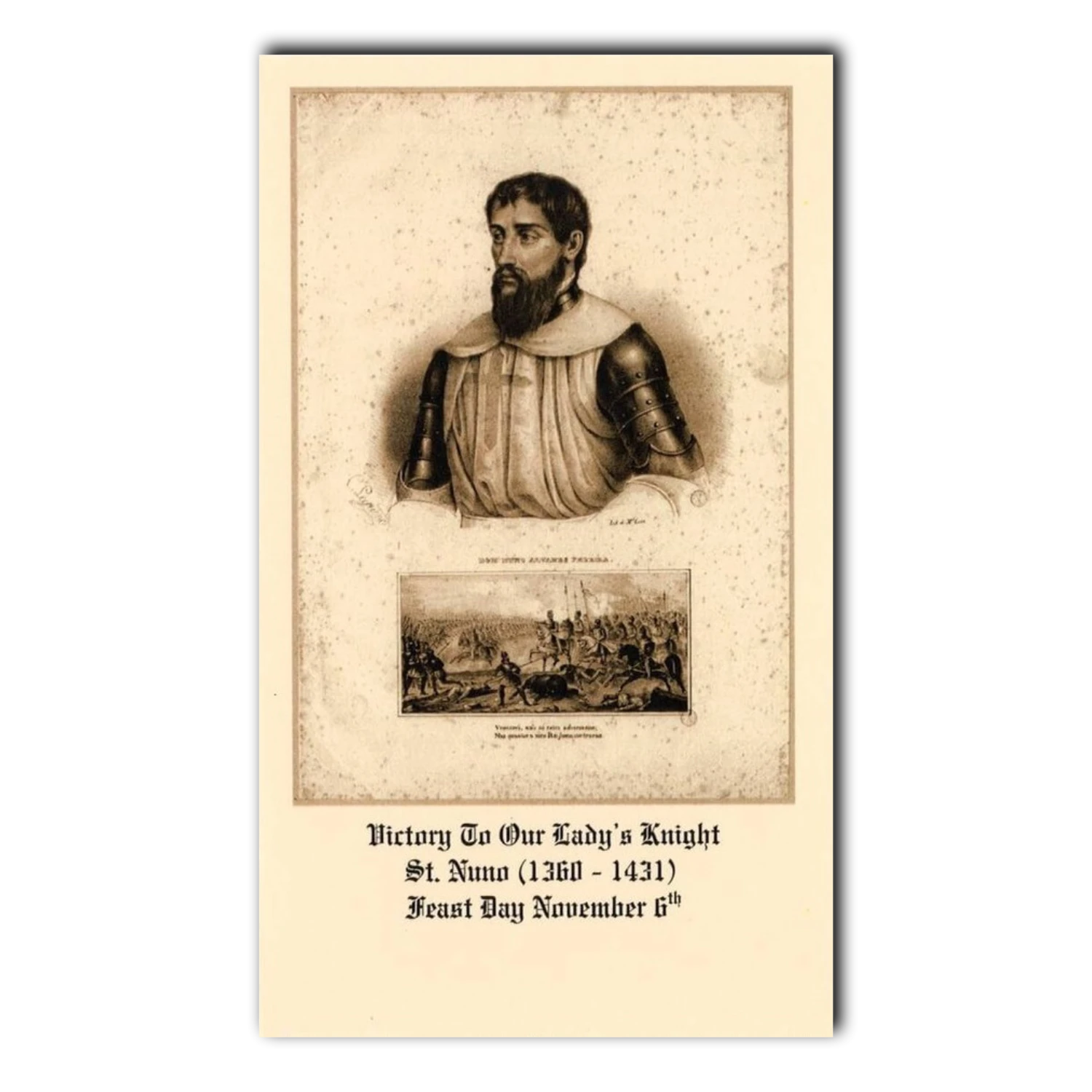 This holy card features an image of Saint Nuno Alvares Pereira in armor and in battle.  On the back is prayer to St. Nuno to aid you in your battles of life to uphold Truth and be Our Lady’s Knight.