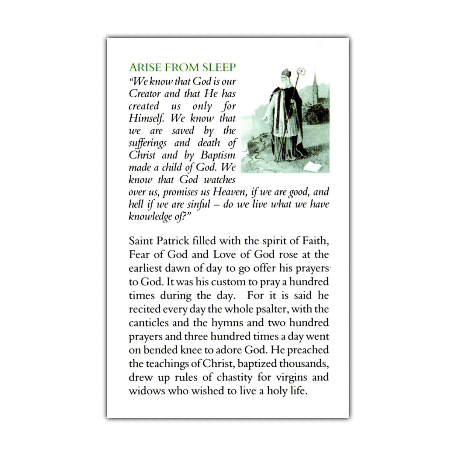 Saint Patrick exhorts us to arise from sleep and live a holy life for the love of God and our neighbor. The holy examples of St. Patrick will encourage us in our sacramental life.  What better way to make St. Patrick known and to imitate his love for God and neighbor then in our homes, parish churches and celebrations honoring the great saint by letting others know the real St. Patrick.  The Saint Patrick Arise From Sleep Holy Card contains these sentiments and a short prayer to St. Patrick, along with a vintage black and white image.