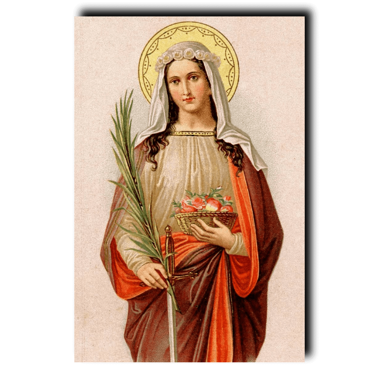 This beautiful print of St. Dorothy, a 4th century Roman martyr, is reproduced from an antique holy card.