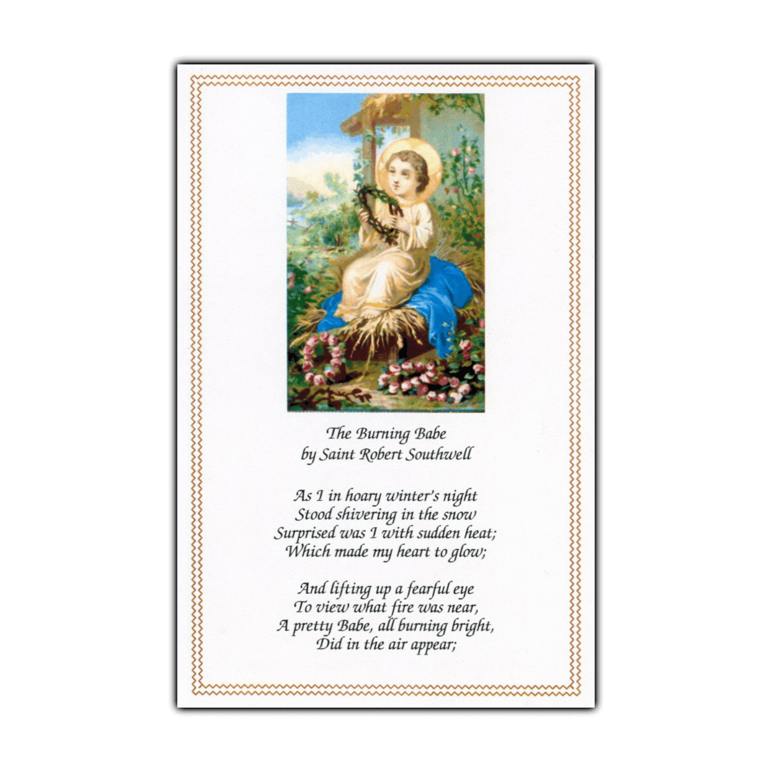 The Burning Babe Christmas holy card features a Christmas poem by English martyr St. Robert Southwell and a vintage image of the Christ Child.
